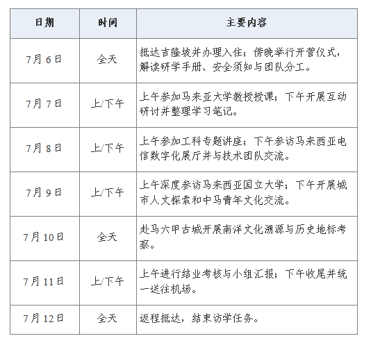 本项目还包含马来西亚国立大学参访交流和企业研学环节,将围绕理工、机械、人工智能、通信技术等主题组织课程、研讨与产业走访,帮助学生理解东南亚工程教育、产业创新和跨文化合作的实践场景。