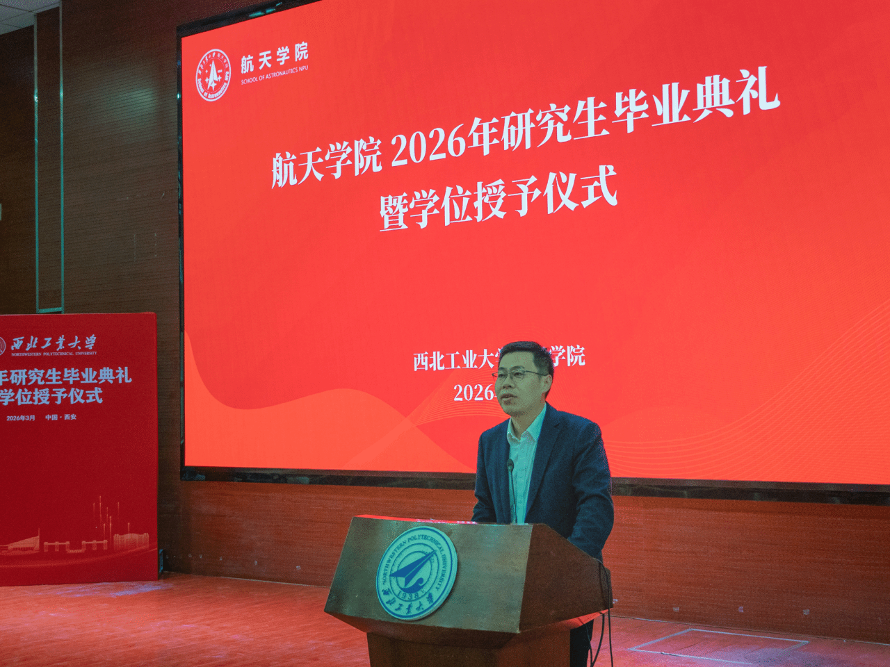 3月30日,西北工业大学航天学院2026届研究生毕业典礼暨学位授予仪式在长安校区教学西楼D100教室隆重举行。航天学院院长黄攀峰、党委书记黄越、副院长党进锋、党委副书记韩冬,各研究所所长、书记,院长助理李阳、郭宁,学院教学管理办公室主任张研,研究生教学管理办公室吕佳妮,研究生辅导员崔美琪等教职工代表出席仪式,与242名圆满完成学业的2026届博士、硕士研究生共同见证这一承载荣光与梦想的重要时刻。毕业典礼由航天学院党委副书记韩冬主持。