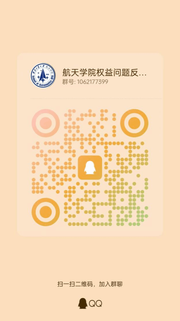 我们建立了航天学院权益问题反馈交流群。在这里,你可以直接提出校园生活中遇到的各种问题,与权益服务中心的志愿者、工作人员实时交流,并获取问题解决的最新进展和反馈。QQ搜索群号:1062177399,或扫描下列二维码即可入群。